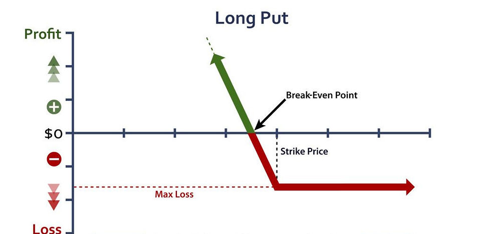 Já esse gráfico mostra o retorno de uma opção put (venda). O lucro aumenta conforme o preço do ativo diminuí, pois é benéfico vender acima do valor real de mercado. Caso o valor de mercado seja maior do que o valor estipulado, o prejuízo será o valor de compra do contrato.