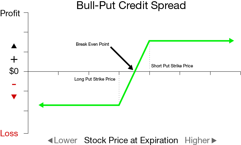 O primeiro passo para a estratégia em questão (put credit spread) se baseia na expectativa de que o preço do ativo não sofrerá mudanças drásticas (caso seja essa a expectativa, a estratégia deve ser outra - veremos no próximo texto). Dessa maneira, o investidor deve vender um put (opção de venda) em um strike price com a expectativa de que o contrato não seja exercido. Caso o preço do ativo esteja abaixo do strike price na data de expiração, o investidor sofrerá uma perda possivelmente significativa. Porém, se o preço do ativo estiver acima do strike price, o contrato não será exercido e o investidor terá o lucro pela comissão paga pela contraparte para o direito de possuir o contrato. Para limitar o risco caso o preço caia abaixo do strike price do put vendido, o investidor compra um put com um strike price menor. Assumindo que o put vendido está mais próximo do preço atual do que o put comprado, o put comprado terá um preço menor do que a comissão recebida pelo primeiro contrato. Assim, garantindo lucro ao investidor caso o ativo se mantenha acima do nível do put vendido, e limitando as perdas (vide imagem abaixo).